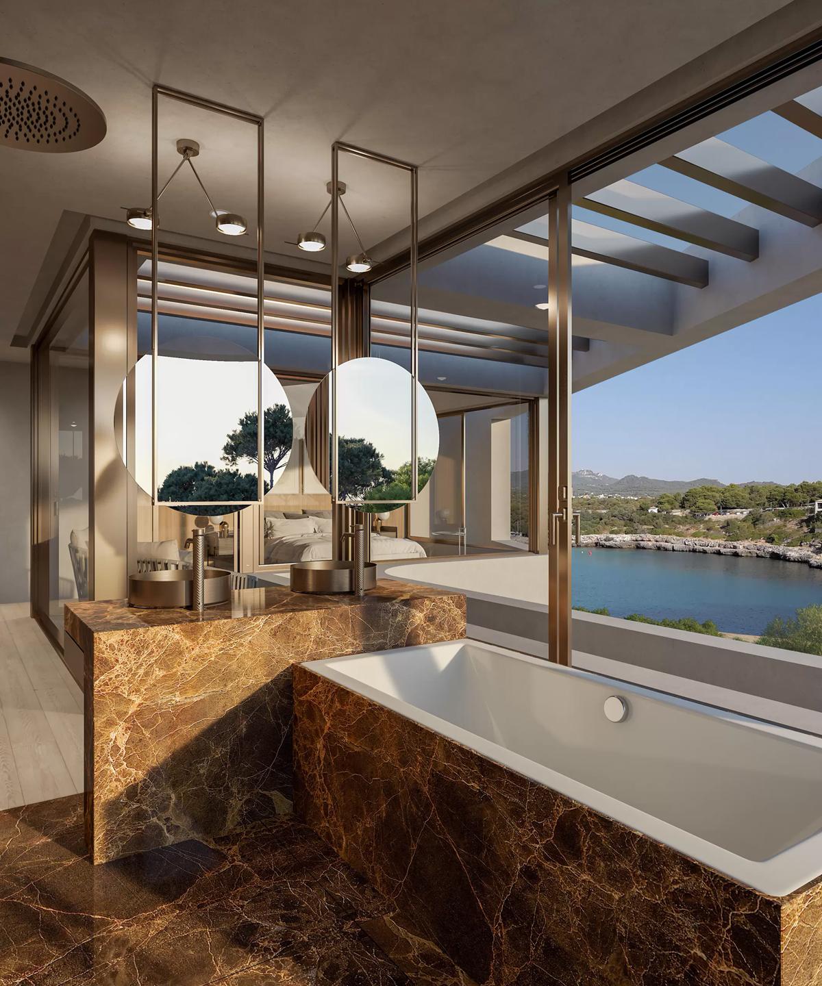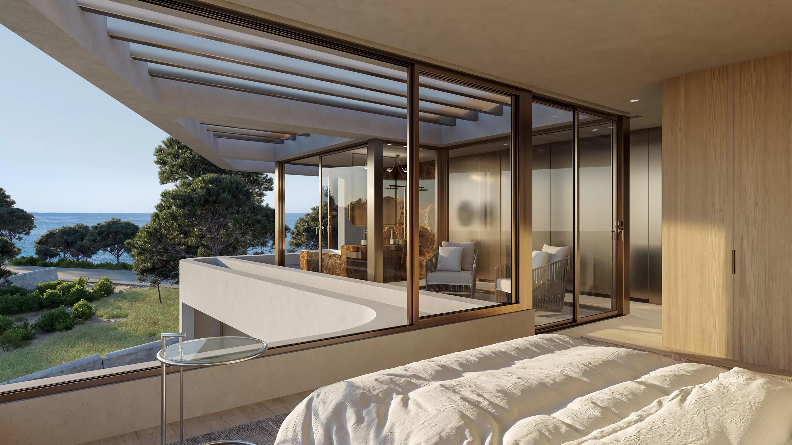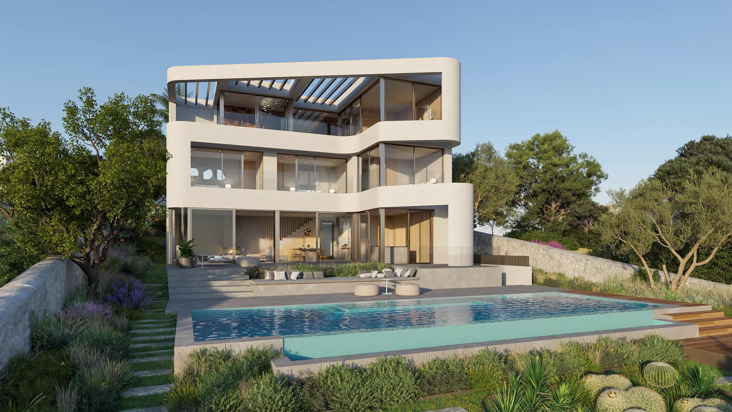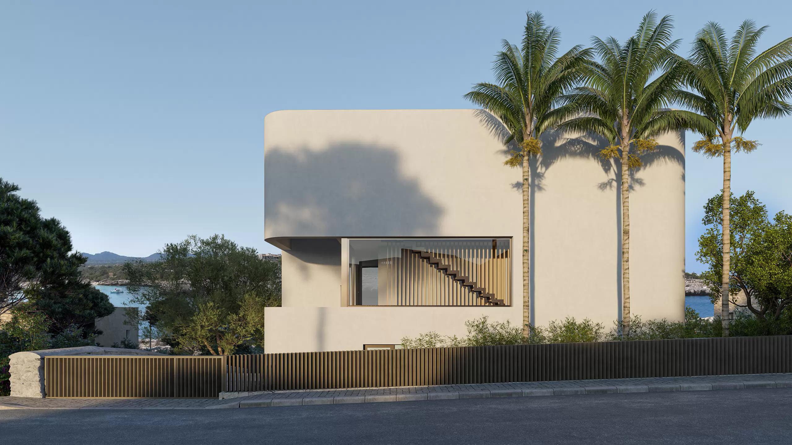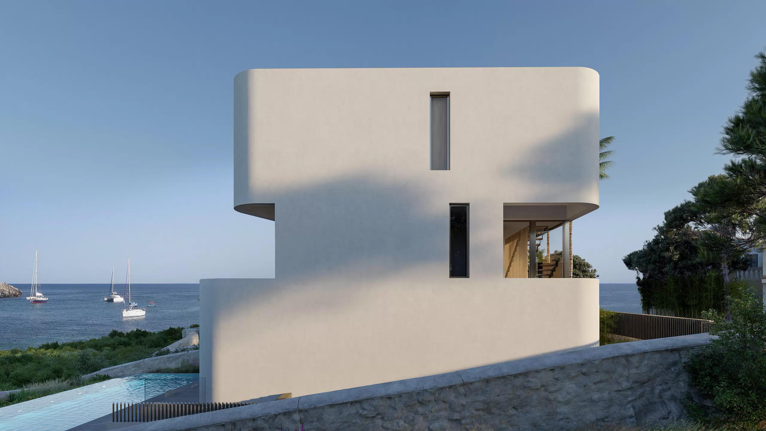 House in Cala Marçal, Mallorca. A sculptural volume overlooking the sea, defined by its soft curves and minimal lines. The architecture embraces simplicity and light, opening discreetly to the Mediterranean horizon.
